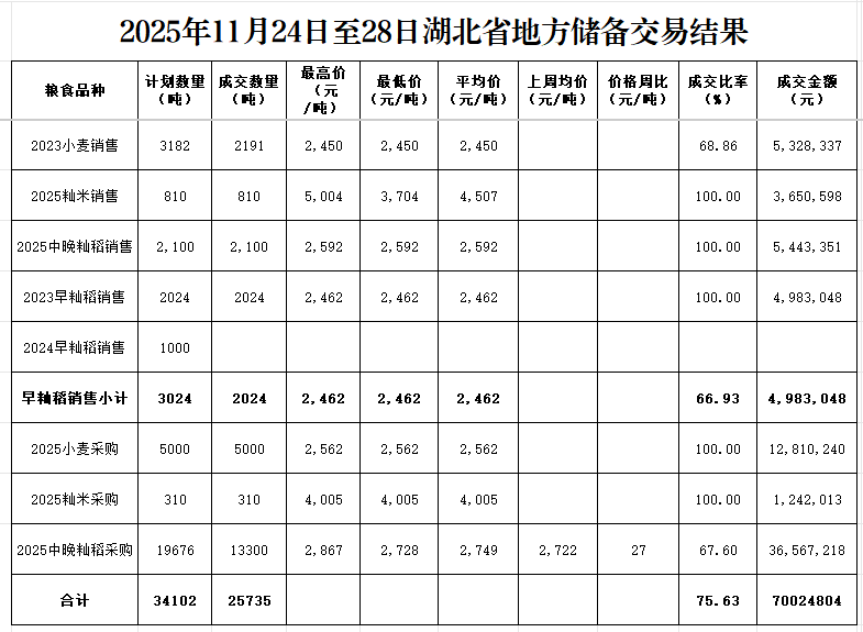 本周(2025年11241128日)湖北无国家政策性粮食投放。